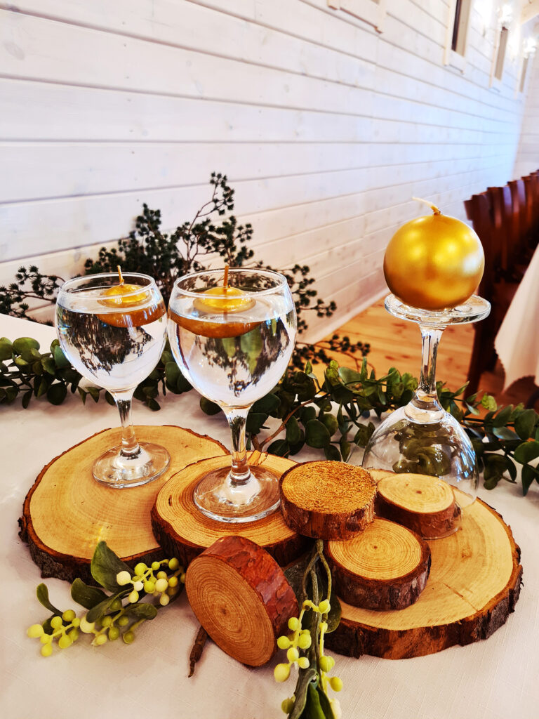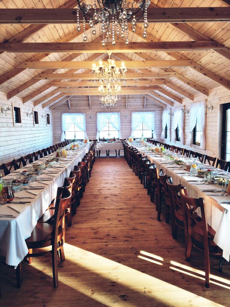 Sala Makadamia jest wkomponowana w otoczenie. Cała drewniana, w kolorach ciepłych brązów. Z jednej strony wtapia się w las, z drugiej rozprzestrzenia widok na zielone, soczyste łąki. Środek sali prezentuje połączenie dwóch styli: RYSTYKALNEGO i GLAMOUR. Połączenie nieoczywiste i rzadko spotykane, jednak nazwa Makadamia zainspirowała nas do stworzenia drewnianego, bielonego wnętrza, w którym drewniane dodatki przeplatają się z kryształowymi żyrandolami i złotymi elementami wystroju. Całość dopełniona jest dużą ilością zielonych motywów roślinnych, które w połączeniu z bielonym drewnem definiują nazwę Makadamia.